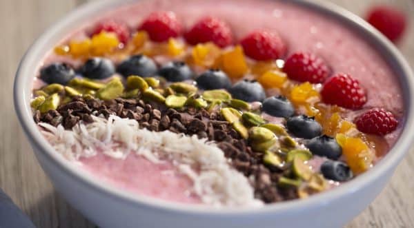 Mezcla los ingredientes de la base del smoothie, vierte el smoothie en un tazón y luego añade las coberturas.