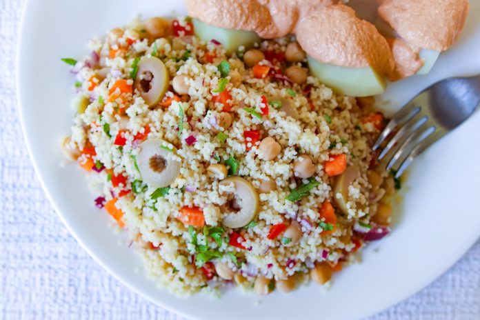 3. Agrega el cuscús cocido al final, usando un tenedor para “aflojarlo” y que se mezcle bien con las verduras.