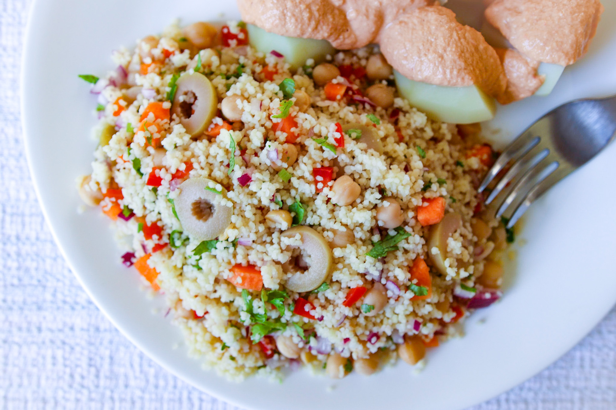 1. Prepara el cuscús colocando una taza de agua hirviendo o caldo en un tazón de vidrio o una olla pequeña. Añade sal al gusto y agrega el cuscús en forma de lluvia. Mezcla y cubre, dejando reposar de 5 a 10 minutos. Deja enfriar.