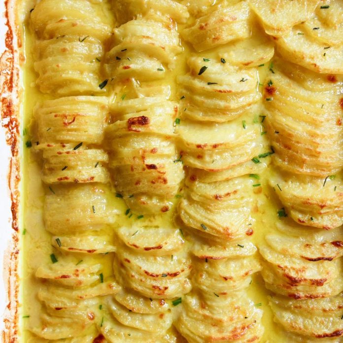 6. Coloque la mitad de las papas en la cacerola, vierta la mitad de la salsa esparciendo uniformemente sobre las papas y permitiendo que se filtre por las grietas. Coloque el resto de las papas en capas y extienda el resto de la salsa sobre ellas de manera uniforme. Cubrir con papel de aluminio y hornear durante 25 minutos.