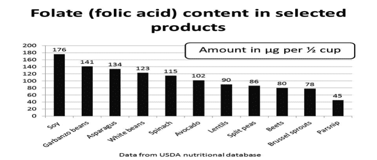 Las frutas y verduras están llenas de una variedad de vitaminas. Una de ellas es el folato, también conocido como ácido fólico, que es necesario para la síntesis del ADN de todas las células del cuerpo. La deficiencia de ácido fólico está asociada con consecuencias muy graves, como defectos del tubo neural en los recién nacidos (por ejemplo, espina bífida [apertura en la columna vertebral]), anencefalia (sin cerebro), hidrocefalia (agua en el cráneo), microcefalia (tamaño pequeño de la cabeza/cerebro) y otros. El ácido fólico también es importante en la prevención de enfermedades cardíacas. Una porción de frutas y verduras como espárragos, brócoli, aguacate, espinaca, fresas y calabaza contiene más del 20 por ciento de la cantidad diaria de esta vitamina. La figura a continuación muestra el contenido de ácido fólico en frutas y verduras seleccionadas.